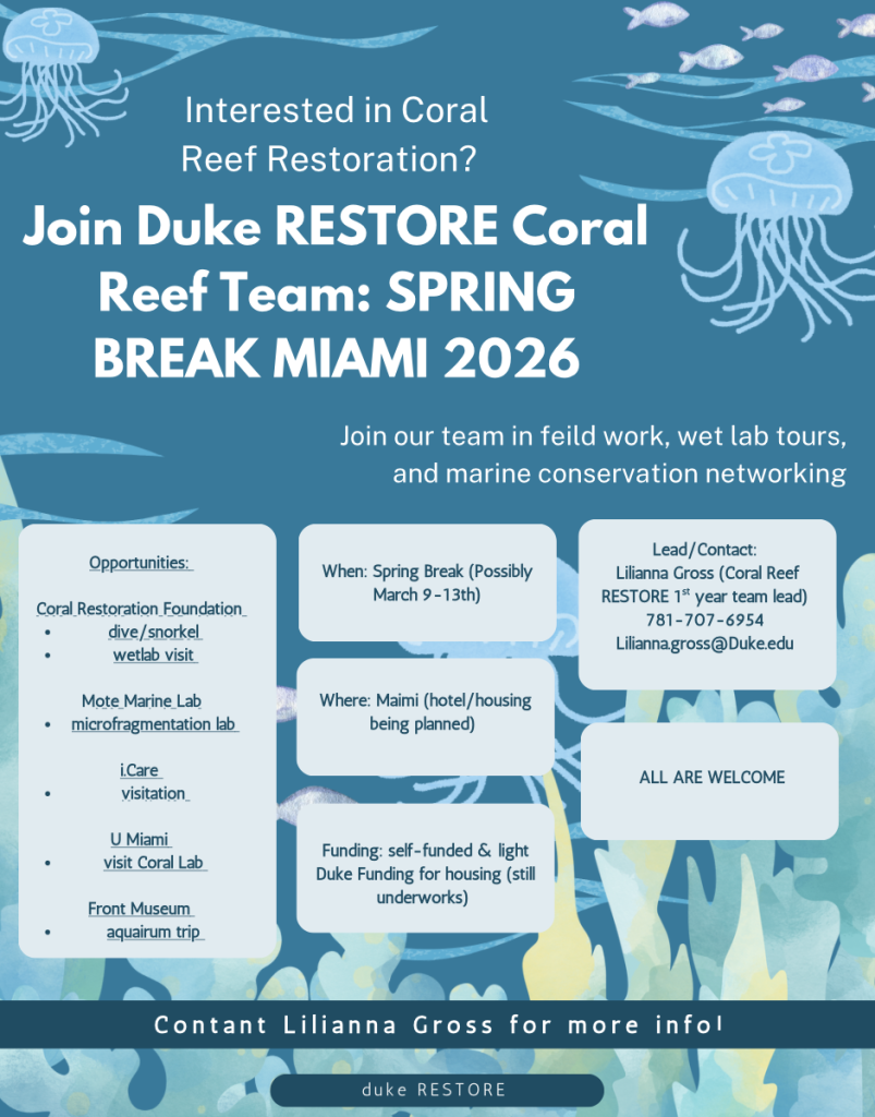 Furthermore, Duke RESTORE is launching its first-ever spring break field experience in Miami, providing students with hands-on exposure to coral restoration efforts and direct engagement with practitioners in the field. A partnership with the Coral Restoration Foundation is providing the opportunity to gain hands-on coral restoration experience.