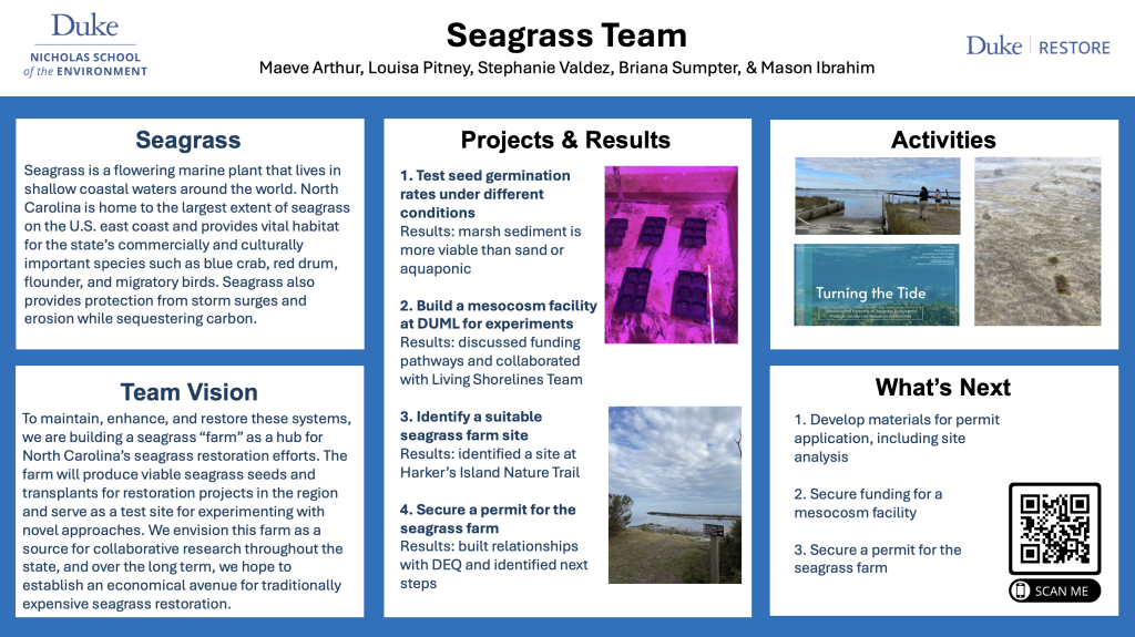 Seagrass provides many beneficial services to humans including recreational and commercial fishery and aquaculture habitat, coastal protection, and carbon sequestration; however, seagrass habitats are declining globally. To maintain, enhance, and restore these systems, we are building a seagrass “farm” as a hub for North Carolina’s seagrass restoration efforts. The farm will produce viable seagrass seeds and transplants for restoration projects in the region and serve as a test site for experimenting with novel approaches. We envision this farm as a source for collaborative research throughout the state, and over the long term, we hope to establish an economical avenue for traditionally expensive seagrass restoration.